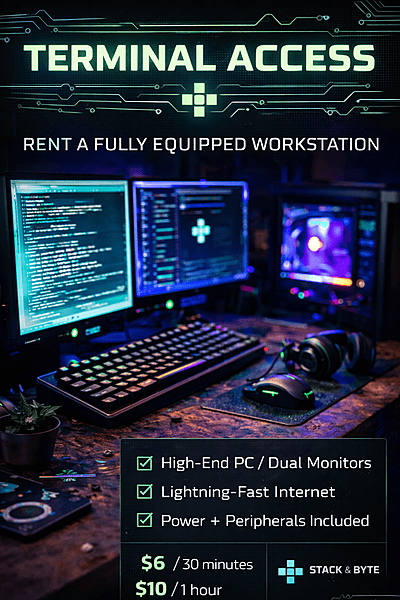 Rent a fully equipped workstation: High-end PC or Mac Dual monitors High-speed internet Power + peripherals included